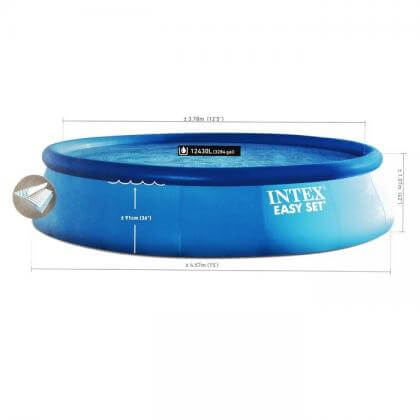 Процесс сборки надувного бассейна INTEX до полного наполнения водой занимает 15 минут. Для установки подходит любая ровная горизонтальная поверхность. Необходимо разложить бассейн на ровном участке, надуть верхнее кольцо и наполнить бассейн водой. По мере наполнения бассейна, надувное кольцо поднимается вместе с уровнем воды и расправляет стенки.