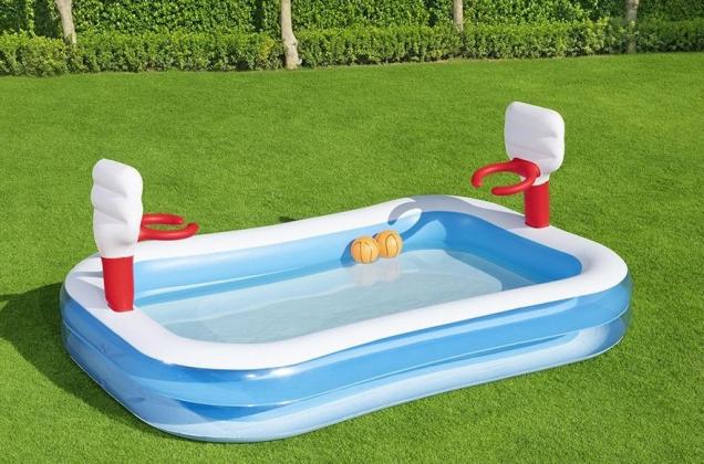 В этом надувном игровом бассейне Bestway у ваших детей будут обручи для классных и точных бросков. В нем можно купаться и играть в игру! Кроме того, широкие стенки обеспечивают устойчивость и поддержку для детей. Он прост в установке, а убрать его легко с помощью дренажного клапана.