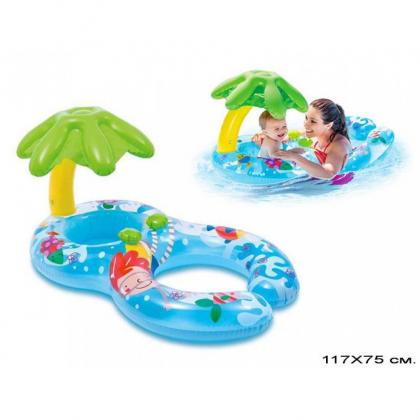 Подходит по размеру самым юным пловцам. Ребёнок удобно разместится внутри круга с поддерживающим сиденьем, а надувная пальма защитит его от солнечных лучей.