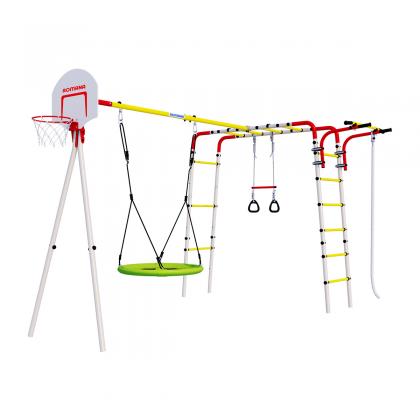 Комплектация: турник подвижный, качели гнездо, рукоход, баскетбольное кольцо, канат, кольца с перекладиной