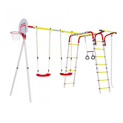 Комплектация: турник подвижный, качели пластиковые 2шт, рукоход, баскетбольное кольцо, канат, кольца с перекладиной