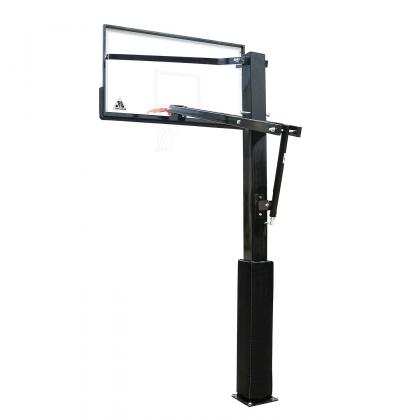 Стойка комплектуется кольцом DFC R3 с амортизацией, способным выдержать нагрузку до 300 кг. Бесступенчатая регулировка высоты осуществляется ручкой, диапазон — от 245 до 305 см. Для монтажа необходимо бетонирование основания с помощью 4 анкеров, входящих в комплект, а яма под площадку должна иметь размеры 50 х 50 см.