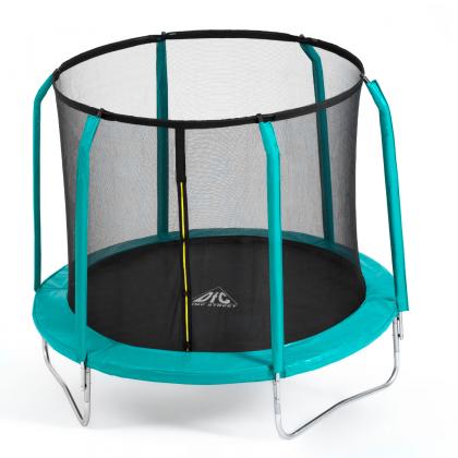 Батуты DFC давно известны на российском рынке. Зарекомендовали себя как надежные, выполненные из качественных материалов, неприхотливы в обслуживании. Представляем вам новую серию батутов от компании DFC - модели JUMP STREET с внутренней защитной сеткой и яркой расцветкой - изумрудный цвет. Высота батутов серии от 46 до 85 см. Особое внимание при изготовлении батутов бренд DFC уделяется качеству. Надежность конструкции обеспечивается прочной рамой. Рама изготовлена из трубы диаметром до 38 мм и толщиной до 1,3 мм. Также стоит обратить внимание на используемое количество пружин. Даже на самом маленьком по диаметру батуте диаметром 5 футов (150 см) используется 30 пружин, что позволяет увеличить высоту прыжка. Пружины выполнены из высококачественной стали, которые имеют повышенную защиту от износа и растягивания, тем самым позволяя продлить срок службы батута. Для обеспечения безопасности пользователя, пружины закрыты защитным чехлом (защитным матом). Прыжковая поверхность выполнена из самого прочного на настоящий момент полипропилена последнего поколения "Перматрон". Внутренняя защитная сетка обеспечит безопасность вам и вашим близким от случайного падения, изготовлена из высокопрочного нейлона, надежно крепится к стойкам батута. Для защиты детей вход/выход через сетку выполнен на молнии с фиксирующими защелками с внешней стороны. Лестница для батута не входит в комплект поставки, приобретается отдельно. В комплекте с батутом поставляются ключи для сборки и подробная инструкция на русском языке. Батуты упакованы в прочную картонную упаковку.