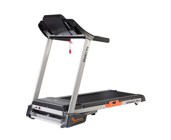 Представляем новую беговую дорожку от популярного бренда DFC - модель SPARKY Pro В своем арсенале дорожка имеет двигатель постоянного тока мощностью 2 л.с. Угол наклона бегового полотна изменяется с помощью дополнительного электромотора. Встроенные динамики звуковой системы и возможность подключения дополнительных устройств через разъем MP3 помогут провести тренировку под любимую мелодию. Два комплекта встроенных в поручни датчиков позволят следить за частотой сердечных сокращений. Такие датчики имеют определенную погрешность. Для точности показаний рекомендуем приобрести нагрудный пояс с монитором в форме часов DFC W117. На поручнях так же расположены "быстрые кнопки" - это кнопки запуска и остановки бегового полотна, и кнопки изменения скорости. Это позволяет не отрывать руки с поручней во время тренировки. Дорожка имеет складную конструкцию для экономии жизненного пространства с помощью гидроцилиндра, и встроенные колеса для перемещения дорожки после тренировки.
