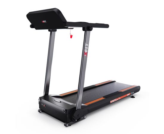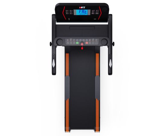 Беговая дорожка DFC X-FIT T-2SLIM — это современное и компактное решение для домашних тренировок. Благодаря складной конструкции и вертикальному хранению она занимает минимум места и легко помещается в небольших помещениях. Модель оснащена 40 программами, включая режим тестирования жировых отложений, а также пятью пользовательскими программами, что позволяет разнообразить тренировки и достигать различных целей. Важной особенностью является установленный механизм защиты питающей сети — индуктор с сетевым фильтром, который подавляет импульсные помехи высокой и низкой частоты, защищая устройство и подключенные к нему электронные приборы. При нестабильном напряжении рекомендуется использовать стабилизатор. Размер бегового полотна составляет 120×45 см, а мощность двигателя — 3 л/с, что позволяет развивать скорость до 16 км/ч. Угол наклона регулируется электронным способом в диапазоне от 0 до 12 процентов, что расширяет возможности тренировок. На дисплее 5 дюймов отображаются параметры: время, скорость, дистанция, калории и угол наклона. Встроенные динамики, USB-порт и MP3 позволяют слушать музыку во время тренировки. Есть возможность подключения кардиомонитора для точного отслеживания пульса. На боковых бортовых подножках можно начать тренировку, встаньте на них, запустите устройство.