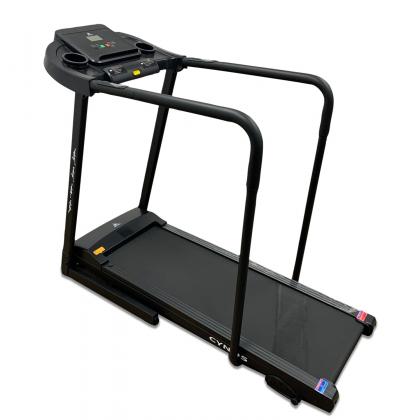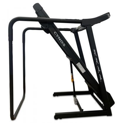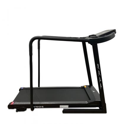 CYNOS — электрическая беговая дорожка чёрного цвета для домашнего применения и использования в спортивных и реабилитационных целях. Модель отличается присутствием в комплектации специальных удлинённых поручней для реабилитационных занятий, возможностью регулировки наклона бегового полотна в трёх положениях. Универсальное применение Эта модель беговой дорожки универсальна. Может использоваться для частных тренировок в домашних условиях при различных нагрузках. Входящие в комплект поручни превращают её в эффективный тренажёр для реабилитации после перенесённых заболеваний и операций на опорно-двигательном аппарате. Для обоих случаев предусмотрены подходящие программы тренировок. Удобство занятий Для максимального комфорта во время тренировок предусмотрены подставка для планшета, две ниши для стаканов или бутылки с водой. На поручнях расположены кнопки регулировки скорости, а также датчики пульса. Имеется 12 встроенных программ тренировок. Дорожка развивает скорость до 12 километров в час. Предназначена для людей, чей вес не превышает 110 кг. Компактное хранение Беговая дорожка CYNOS имеет складную конструкцию. В сложенном виде она занимает минимум места, что удобно для небольших квартир. Есть два варианта хранения: с поручнями или без них. Первый подходит, если нужно регулярное использование дорожки. Во втором случае поручни снимаются для более длительного и компактного хранения (например, в кладовой). Транспортировочные ролики позволяют легко перемещать её при необходимости.