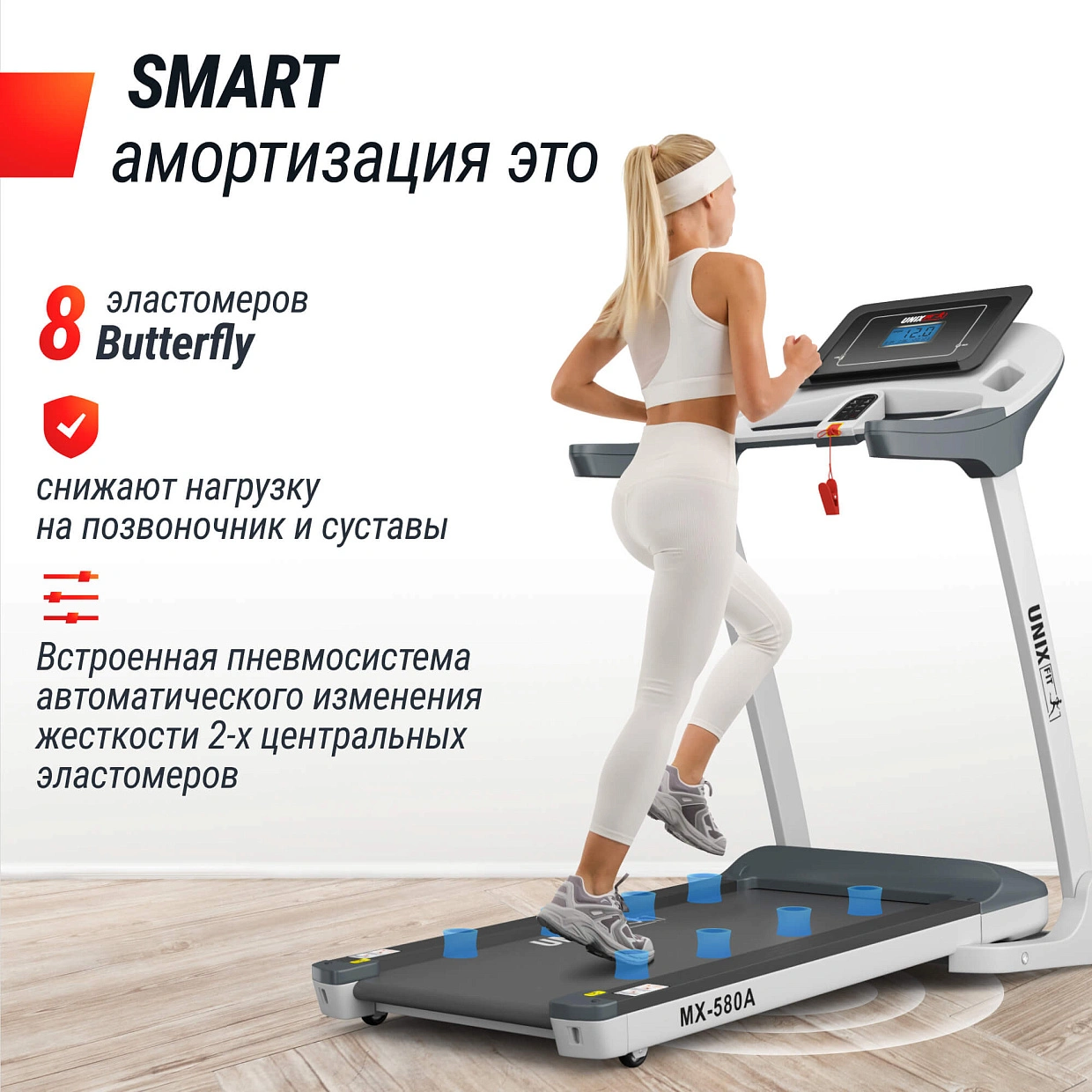 Особое внимание уделено заботе о ваших суставах и спине благодаря уникальной системе умной амортизации. Встроенная пневмосистема автоматического изменения жесткости амортизации двух центральных эластомеров предназначена для улучшения показателей выносливости и силы мышц ног. Восемь эластомеров бабочек / Butterfly эффективно нейтрализуют до 95% ударной нагрузки, обеспечивая мягкость движений и снижая риск травмирования позвоночника и коленей.