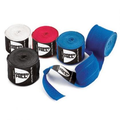 Бинты боксерские "GREEN HILL" , из хлопчатобумажной ткани, не тянутся, обеспечивают плотное стягивание. Боксерский бинт используется для бинтования кистей рук, предотвращения травм суставов пальцев, обеспечивается такая защита путем плотного стягивания пальцев бинтом друг к другу, что создает единую площадь удара и способствует распределению нагрузки. Также бинт полезен во время тренировок, впитывая пот ладоней, не давая загрязняться внутренней части перчаток. Упакованы парами в полиэтиленовый пакет.