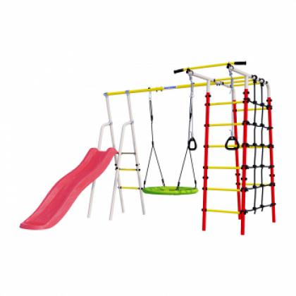 Комплектация: горка, качели гнездо, кольца гимнастические, канатный лаз, шведская стенка, турник