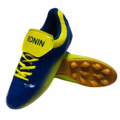 Описание: Бутсы Ronin прошитые, литая подошва стеклопластик, усиленная с литыми плоскими шипами. Материал верха - искусственная кожа ЭВА, прочная к воздействию. Сине-желтый дизайн. Для игры на травяных покрытиях.
