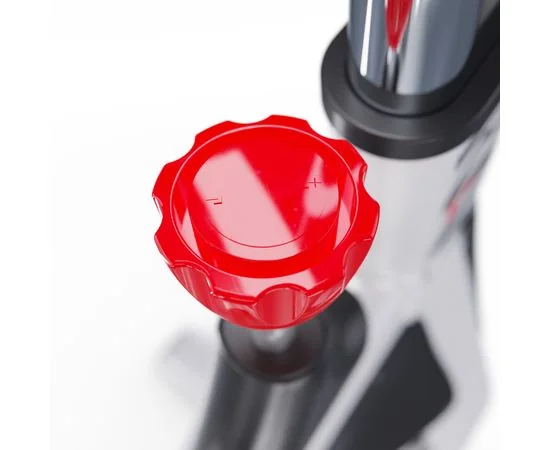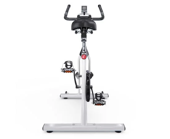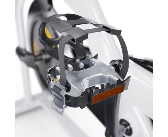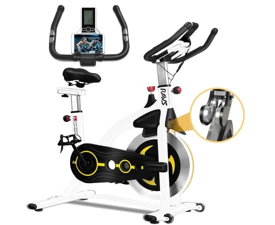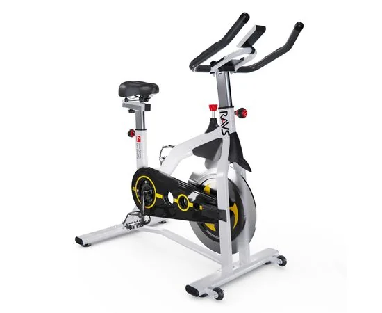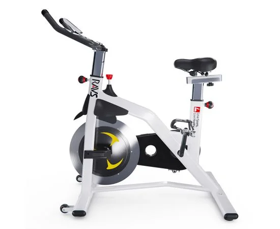 Спин-байк RAVS белого цвета имеет прочную стальную раму, что повышает его устойчивость и обеспечивает быструю езду. Он также оснащен большим алюминиевым маховиком с инерционным весом 19 кг, который обеспечивает дополнительный импульс и реалистичные ощущения от езды с препятствиями. Максимальный вес пользователя до 150 кг.