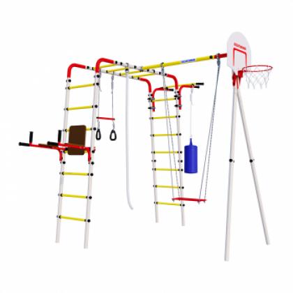 Комплектация: турник, качели фанерные, баскетбольный щит, лестница гимнастическая, перекладина, брусья, кольца с перекладиной, груша боксерская, рукоход