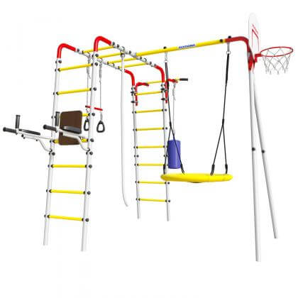 Комплектация: турник, баскетбольный щит, перекладина, брусья, кольца с перекладиной, груша боксерская, качели гнездо;
