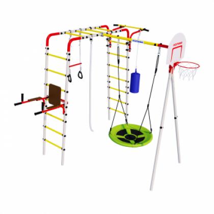 Комплектация: турник, качели гнездо, баскетбольный щит, лестница гимнастическая, перекладина, брусья, кольца с перекладиной, груша боксерская, рукоход