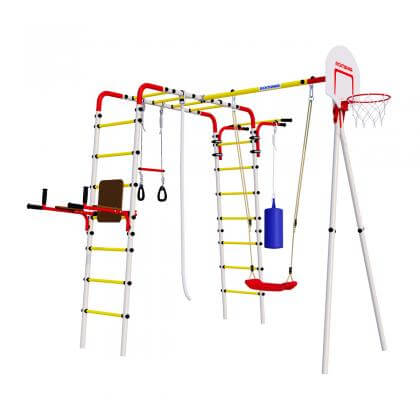 Комплектация: турник, качели пластиковые, баскетбольный щит, лестница гимнастическая, перекладина, брусья, кольца с перекладиной, груша боксерская, рукоход