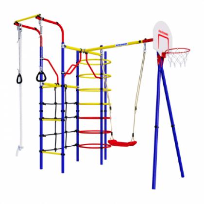 Комплектация: кольца гимнастические, качели пластиковые, канатный лаз, канат, шведская стенка, турник, баскетбольный щит, лаз круговой