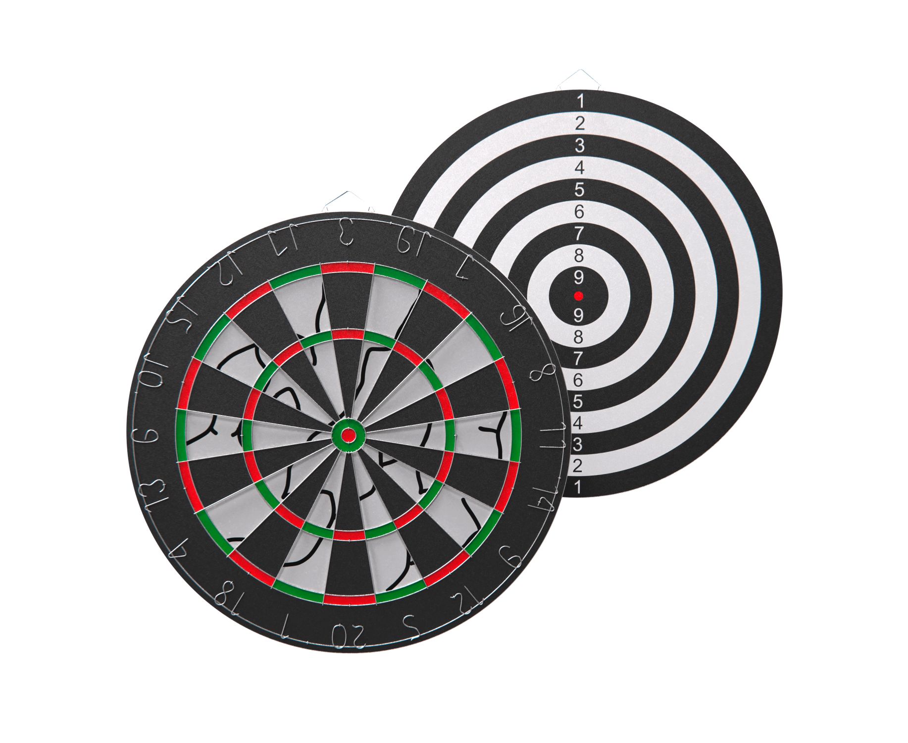 Комплект мишени включает в себя 6 дротиков с пластиковыми наконечниками. Каждый дротик весит 16 грамм, что делает его легким и удобным для бросков. Кроме того, в комплекте идут флайты с американским и английским флагами, что делает эту мишень еще более интересной. Диаметр мишени составляет 34 см с одной стороны и 45 см с другой.