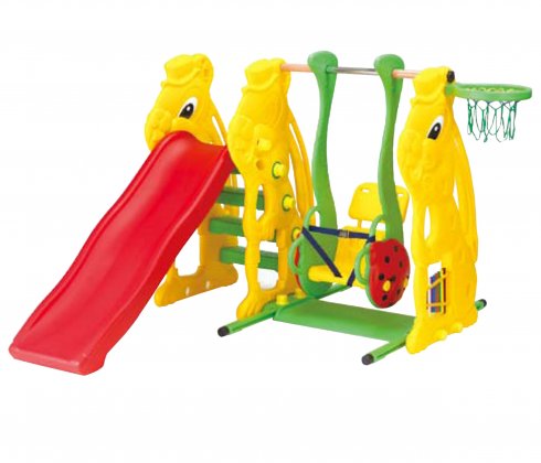 Комплектация: пластиковая горка, лесенка, кольцо баскетбольное, надувной мяч, качели
