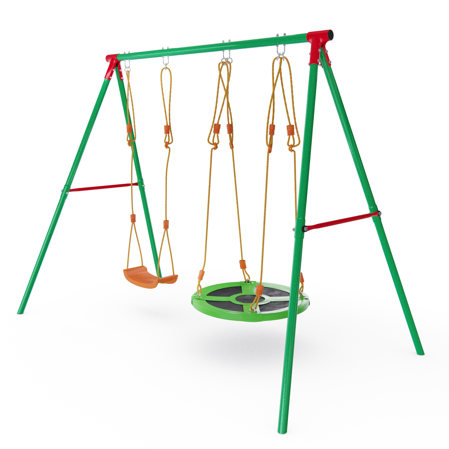 В комплект входят веревочные качели, которые мы все помним с детства, и современное качели-гнездо — для разнообразия развлечений. Опорные элементы выполнены из стального профиля повышенной прочности (25,4×1,0 мм, 45×1,5 мм, 50,8×2 мм), что соответствует стандартам безопасности и обеспечивает надежность конструкции. Каркас усилен дополнительными элементами для жесткости и долговечности. Играть на комплексе разрешается детям от 3 лет, а максимальная нагрузка — 70 кг.