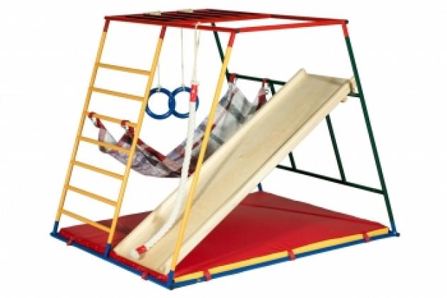 Комплектация: каркас, горка, гамак, кольца гимнастические деревянные, канат, мат гимнастический