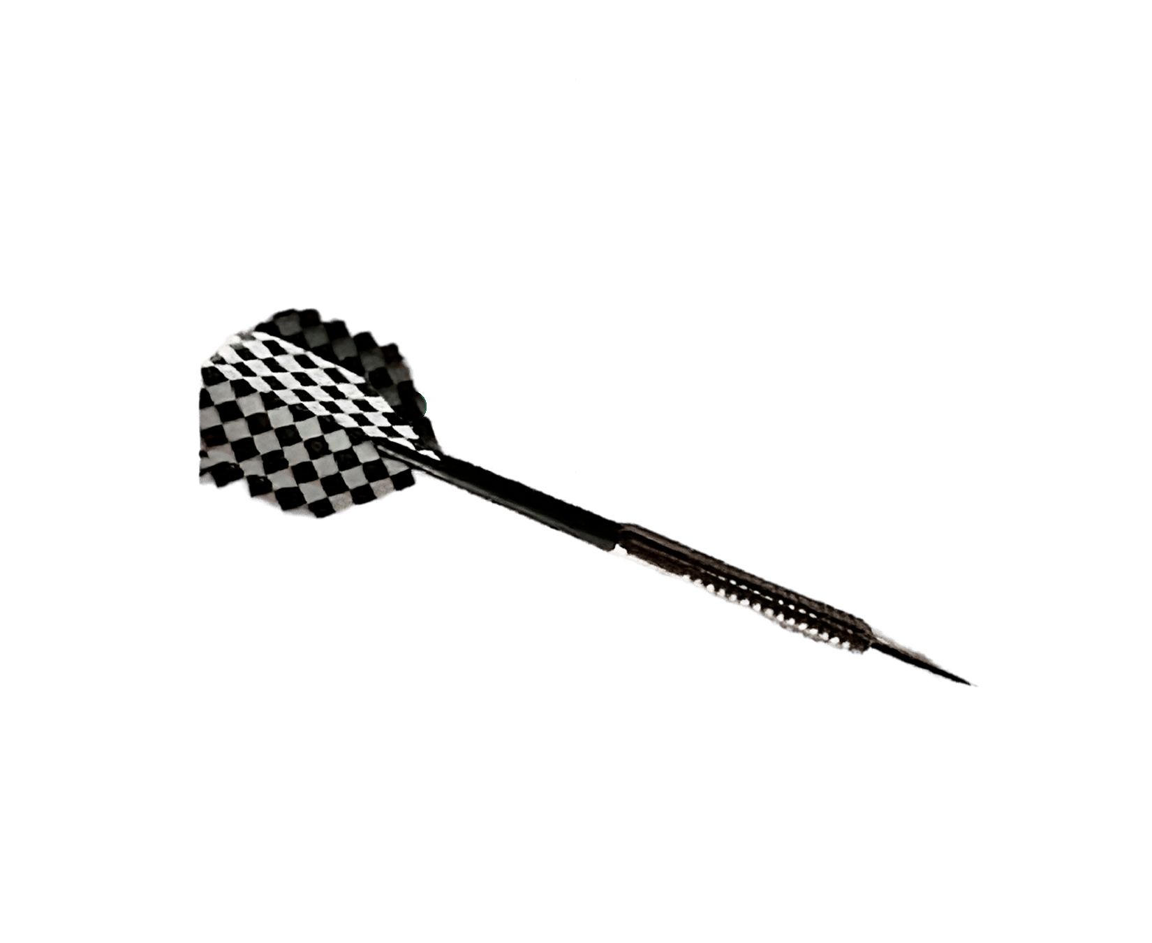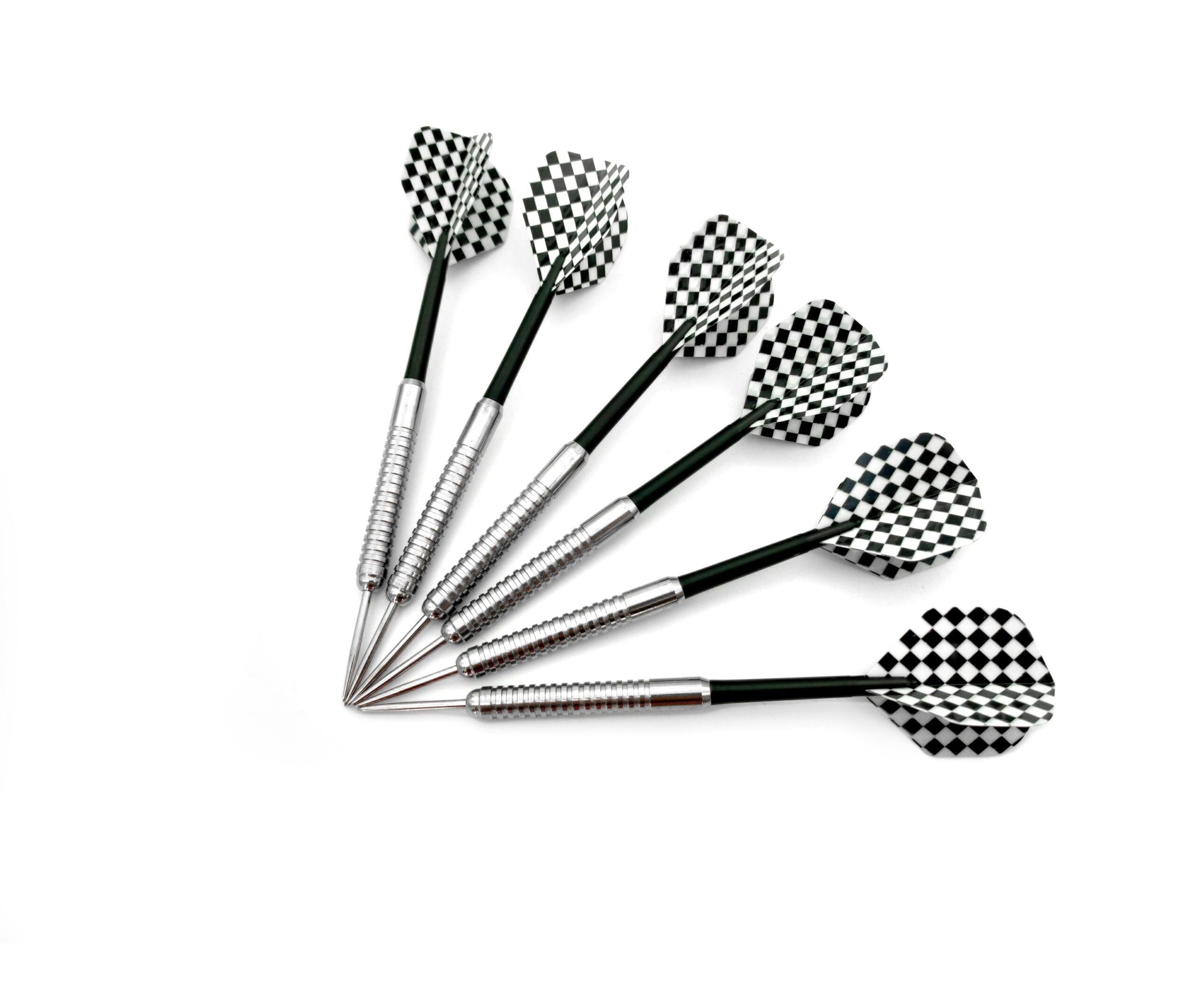Набор дротиков для дартса DAR3071, состоящий из 6-ти дротиков с чёрно-белым узорчатым флайтом и металлическим держателем. Каждый дротик имеет вес 19,5 грамм, что делает их подходящими для использования опытными или профессиональными игроками.