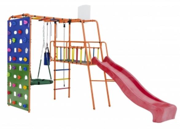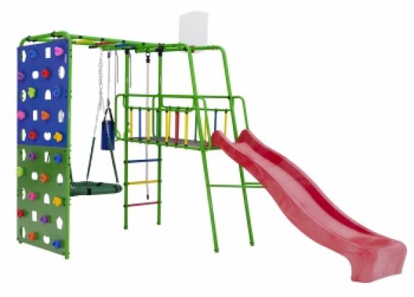 Комплектация: канат, гимнастические кольца, качели-гнездо, баскетбольное кольцо, скалодром, боксерский мешок, горка