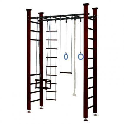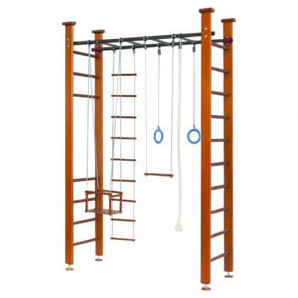 Комплектация: шведская стенка,рукоход, качели, канат, верёвочная лестница, трапеция, кольца пластиковые