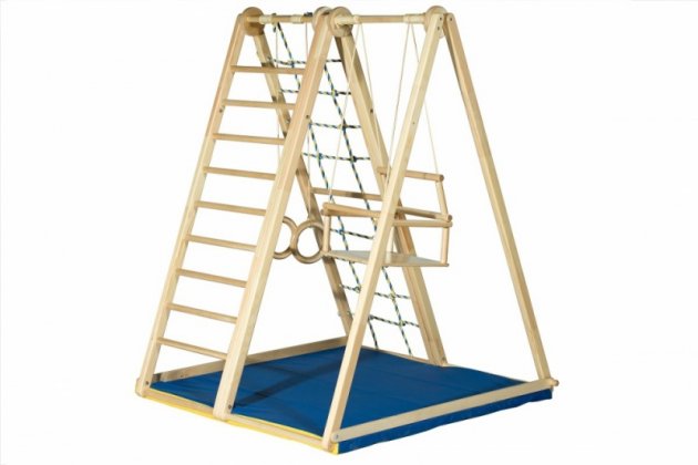 комплектация: каркас, сетка веревочная, кольца гимнастические деревянные, качели деревянные, мат гимнастическийж