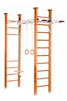 комплектация: шведские стенки разборные, рукоход, турник мобильный с неопреновыми ручками, кольца гимнастические деревянные, тарзанка