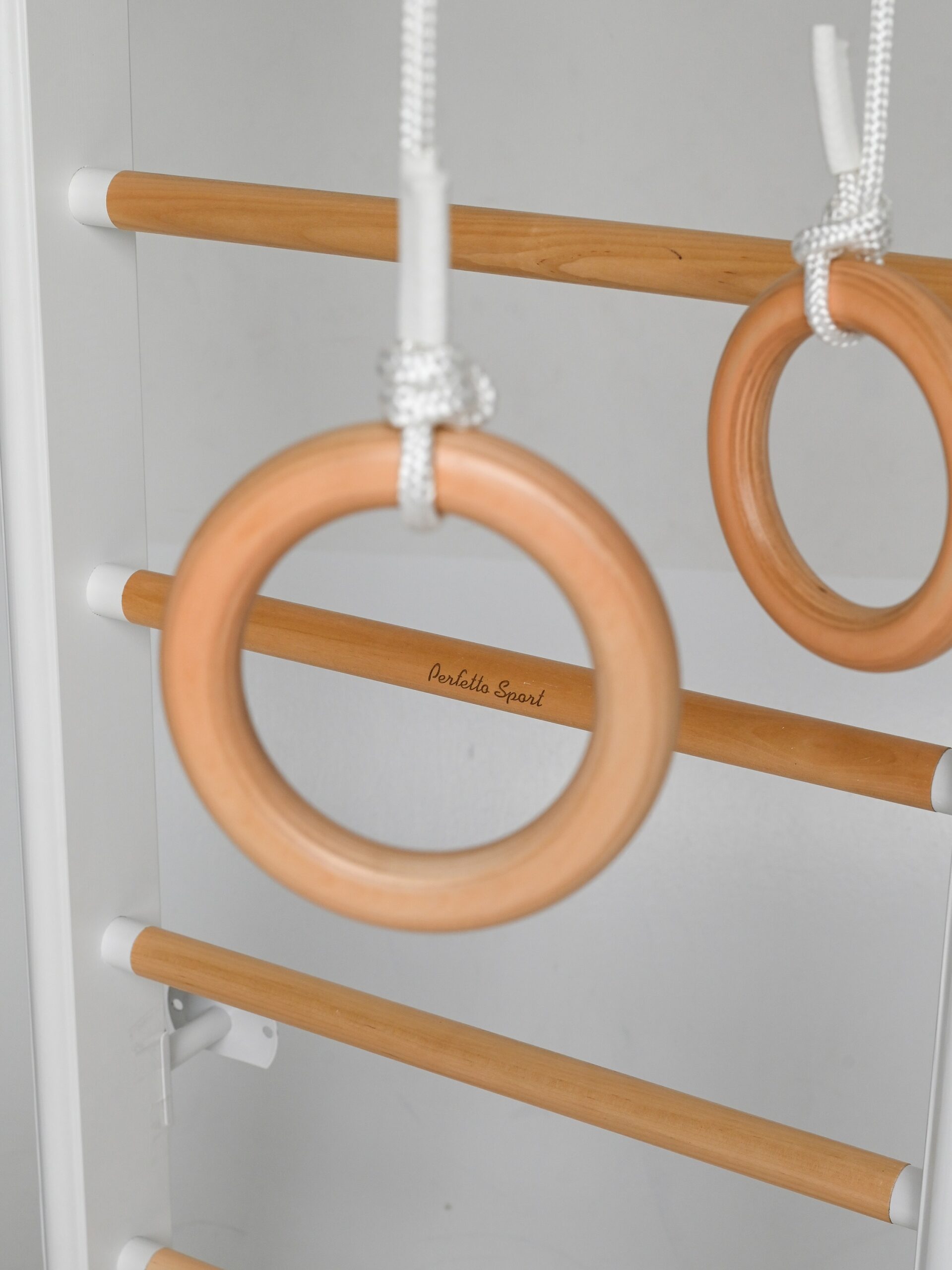 ✔ Многофункциональность: стационарный турник с неопреновыми ручками, деревянные гимнастические кольца, лиана — для разнообразных упражнений