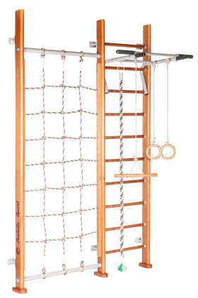 комплектация: шведская стенка разборная, турник стационарный с неопреновыми ручками, кольца гимнастические деревянные, - тарзанка, канат, стойка с сеткой .