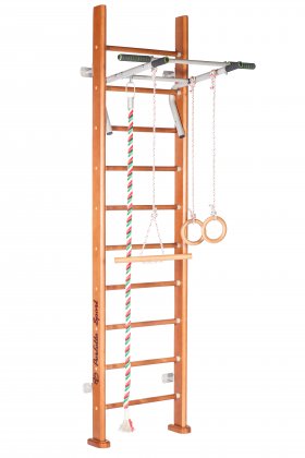 комплектация: шведская стенка разборная, турник стационарный с неопреновыми ручками , кольца гимнастические деревянные, тарзанка, канат.