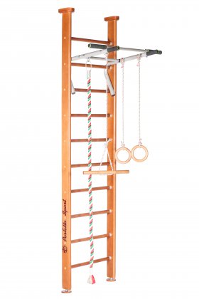 комплектация: шведская стенка разборная, турник стационарный с неопреновыми ручками , кольца гимнастические деревянные, тарзанка, канат