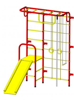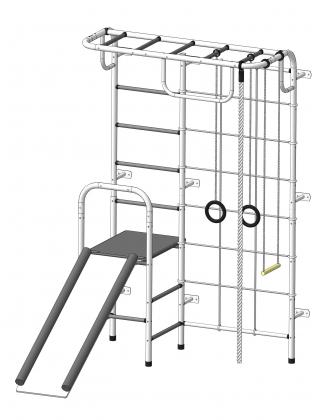 Комплектация: канат, кольца, трапеция, турник, рукоход, канатный лаз, площадка для горки, горка