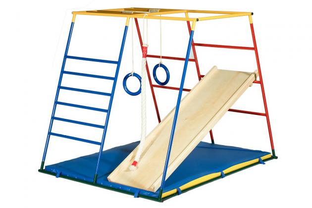 Комплектация: каркас, горка, кольца гимнастические деревянные, канат, мат гимнастический