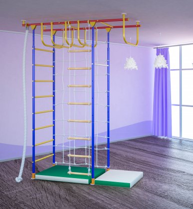 комплектация: турник, канат, кольца, верёвочная лестница, трапеция, рукоход, сетка