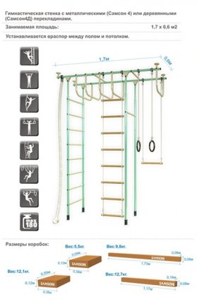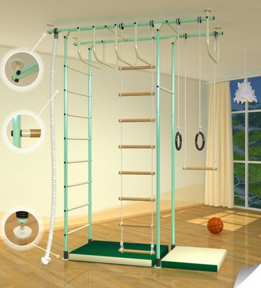 комплектация: турник, канат, кольца, верёвочная лестница, трапеция, рукоход