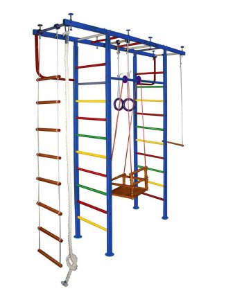 комплектация: два турника, турник длинный, канат, кольца, трапеция, рукоход, две шведские стенки, деревянные качели