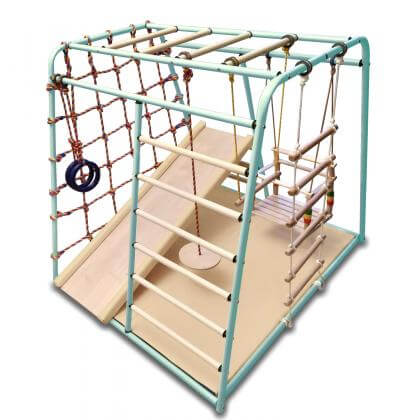 Комплектация: качели, веревочная лестница 6 ступеней, кольца гимнастические, трапеция, тарзанка, сетка-паутина, горка, мат(бежевый)