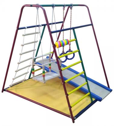 Комплектация: качели, кольца гимнастические,веревочная лестница 6 ступеней, горка с мягкими бортиками, мат;