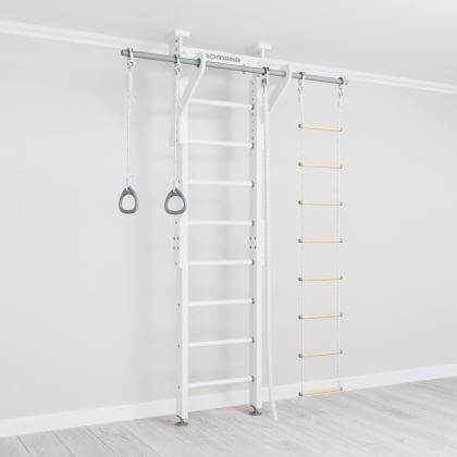 Комплектация: турник неподвижный, кольца гимнастические, канат, лестница веревочная;