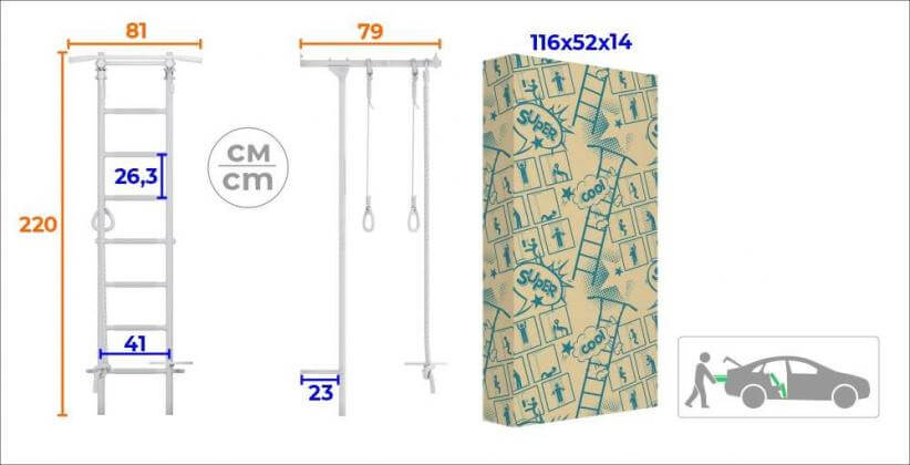Комплектация: турник, кольца гимнастические, трапеция, подвес;