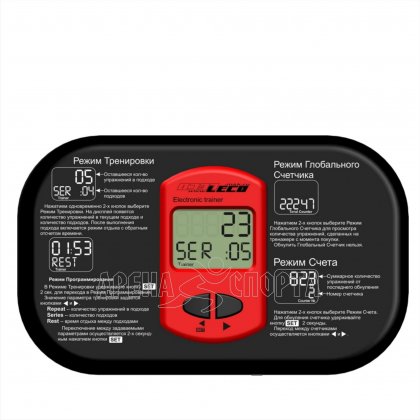 Режим тренировки - устанавливаются количества повторений до 99, количества серий до 20 и время отдыха между сериями.Режим счетчиков - все счетчики независимы и считают до 10.000.Удобно заниматься и к примеру смотреть телевизор или слушать музыку. Считает за Вас количества упражнений, количество подходов и время отдыха между упражнениями, дает звуковой сигнал.