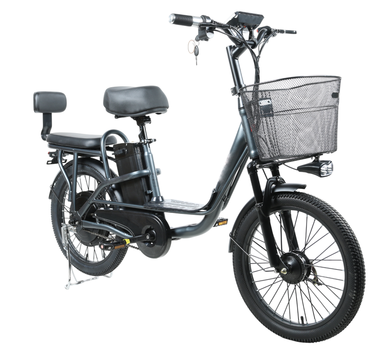 Этот электробайк оснащен широким мягким седлом, вместительным багажником-трансформером и передней корзиной для перевозки грузов. Передняя амортизационная вилка сглаживает неровности дороги, а широкие 20-дюймовые литые колеса обеспечивают отличную управляемость и устойчивость.