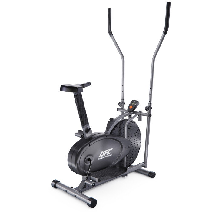 Компактный эллиптический тренажер DFC E8.2A с ременной системой нагрузки предназначен для домашнего использования. Модель черного цвета с классической конструкцией и передним расположением маховика (5 кг) обеспечивает плавный ход при длине шага 29 см.