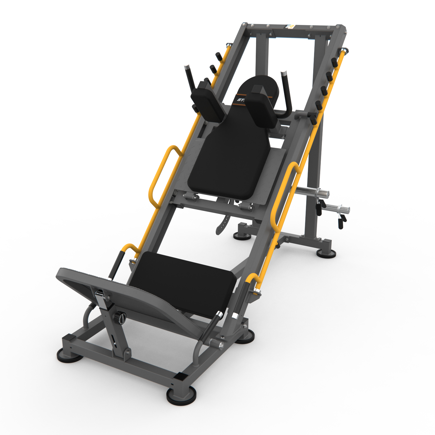 Силовой тренажер Stonerise DLP05 — это мощное и универсальное оборудование для домашних и профессиональных тренировок. Он позволяет выполнять не только классический жим ногами, но и гакк-приседания, которые являются более безопасной альтернативой тяжелым приседаниям со штангой. Благодаря профилю из прочной стали 50×50 мм толщиной 2 мм и уникальной U-образной направляющей толщиной 5 мм, тренажер обеспечивает исключительную стабильность и долговечность. Максимальная нагрузка до 400 кг делает его подходящим для интенсивных тренировок как начинающих, так и профессиональных спортсменов. Угол наклона спинки для приседаний регулируется на 4 уровня, а для жима ногами — на 6 уровней, что позволяет точно настроить тренажер под индивидуальные параметры. Платформа для ног с рифлёным покрытием толщиной 5 мм регулируется по высоте, а стопорные болты диаметром 25 мм позволяют установить подушки на 5 уровней. Размеры в рабочем виде — 203,5×92,5×190 см, вес — 137 кг (минимум) или 182 кг (максимум). Перед использованием требуется сборка. Этот тренажер — идеальный выбор для тех, кто хочет развивать мышцы ног, спины, плеч, рук и ягодиц в домашних условиях.