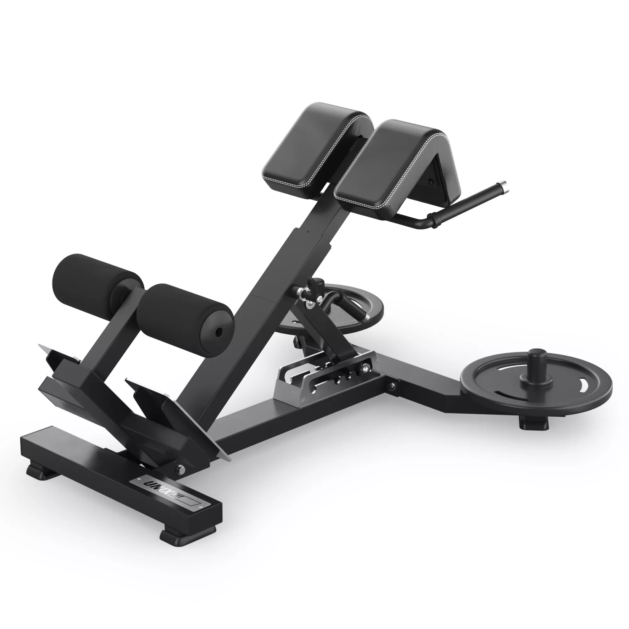 Тренажер для спины оснащена дополнительными адаптерами на которые можно добавлять нагрузку в виде дисков для повышения уровня сложности упражнений. Обрезиненная платформа для ног обеспечивает стабильность и комфорт на протяжении всего упражнения. Высота подушек для упора регулируется под любой рост. Упоры для ног выполнены из металла.