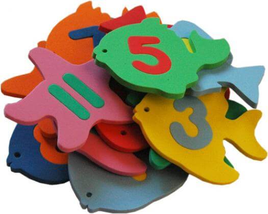 Игровой набор «Рыбки-цифры» служит для развития тактильных ощущений, цветовосприятия, а также памяти, внимания и мелкой моторики. Кроме этого веселые разноцветные рыбки познакомят малышей с простейшими математическими действиями. Фигуры изготовлены из приятного на ощупь, не содержащего токсичных веществ мягкого полимера EVA. Работа с набором может проводится как на поверхности воды (формы отлично плавают), так и на стенках бассейна (становясь влажными, фигуры хорошо приклеиваются к плитке).В наборе 10 рыбок с цифрами от 0 до 9 и морские звездочки со знаками «плюс», «минус», «равно» (всего 13 предметов).