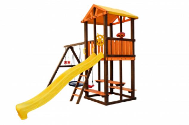 Комплектация: игровой домик, столик, лавочка - 2 шт, лестница, скат, ручка пластиковая - 2 шт, А-опция, качели "Лодочка" 2 шт, кольца "Микки", штурвал "Шторм", бинокль "Капитан", качели "Паутина"