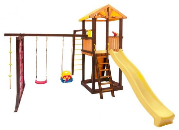 Комплектация: игровой домик, песочница, лестница, скат, ручка пластиковая - 2 шт, Р-опция, П-опция, качели "Лодочка", качели "Малыш", канат с зацепами, штурвал "Шторм", бинокль "Капитан", скалодром маленький